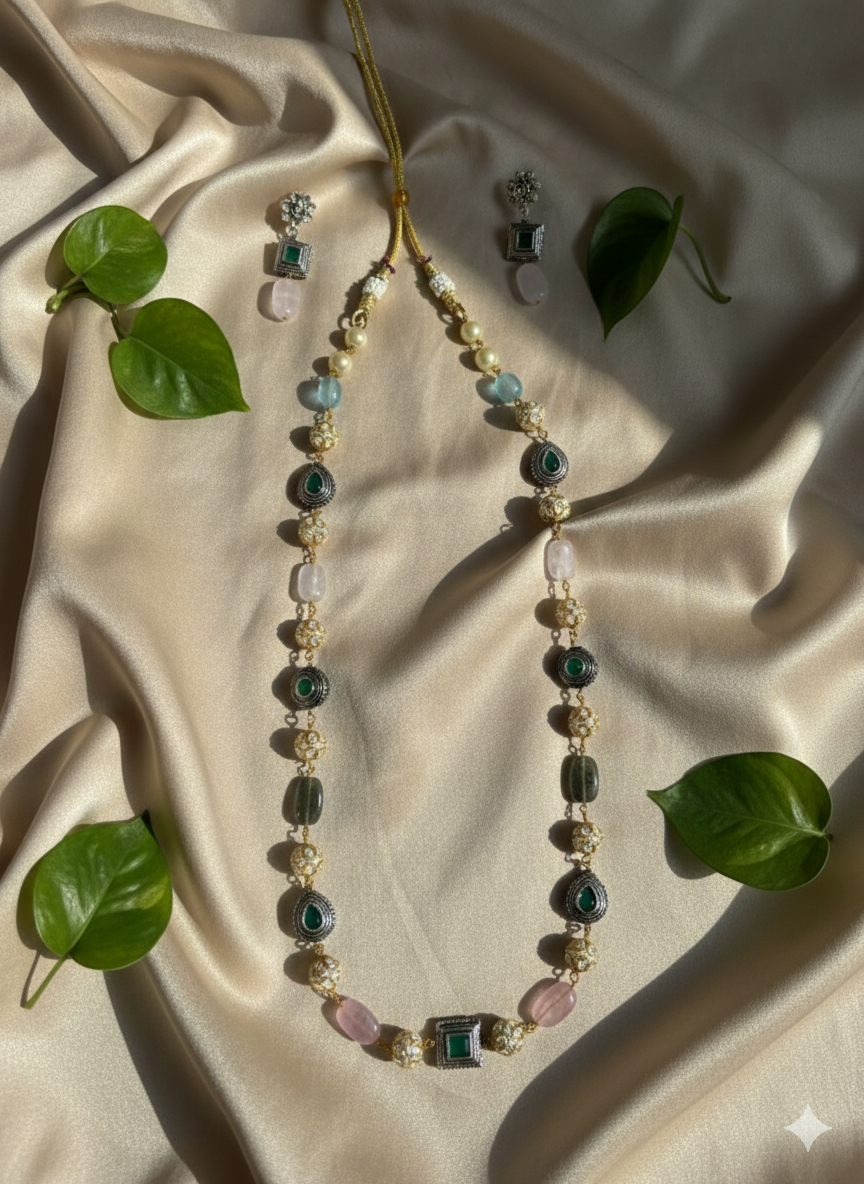Elevate your style with the Royal Mala. This exquisite piece is designed to give you a regal look, perfect for special occasions. Made with the finest craftsmanship, this mala exudes elegance and sophistication, making it a must-have accessory for those looking for a touch of luxury.