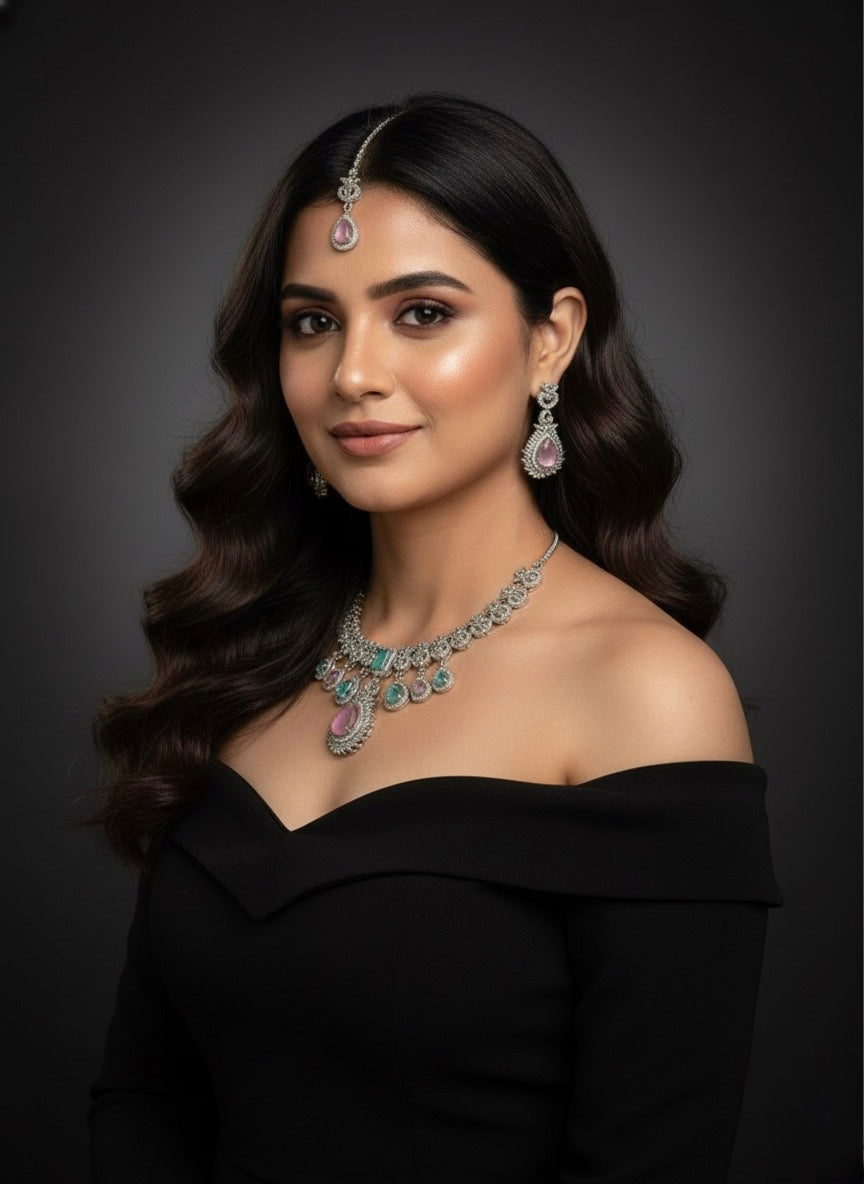 Enhance your bridal look with our Diva AD Necklace. Inspired by Bollywood, this neckpiece...