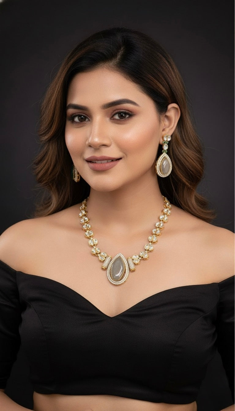 Effortlessly combine traditional and modern aesthetics with Naira Kundan Necklace. Perfect for any setting, this ad set is designed to catch the eye and leave a lasting impression. With a mix of classic and contemporary elements, Naira Kundan necklace will elevate your style.