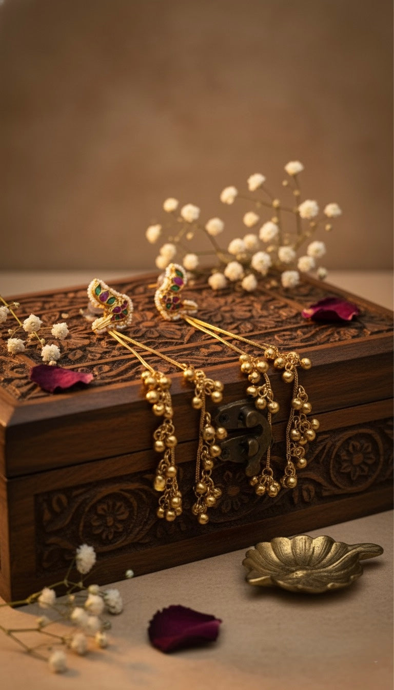To keep your jewellery looking its best, avoid contact with perfumes, water, or harsh chemicals. Store pieces in a dry pouch after use and gently wipe them with a soft cloth to maintain their shine and durability.