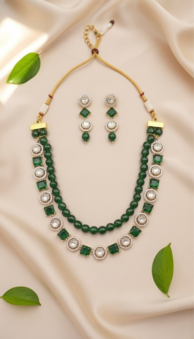 Indulge in a regal look with our Vamika Layered Kundan Necklace in a rich green hue. This Maharani-inspired necklace set exudes elegance and grace with its intricate kundan detailing and layered design. Perfect for special occasions, this necklace will bring out your inner queen.